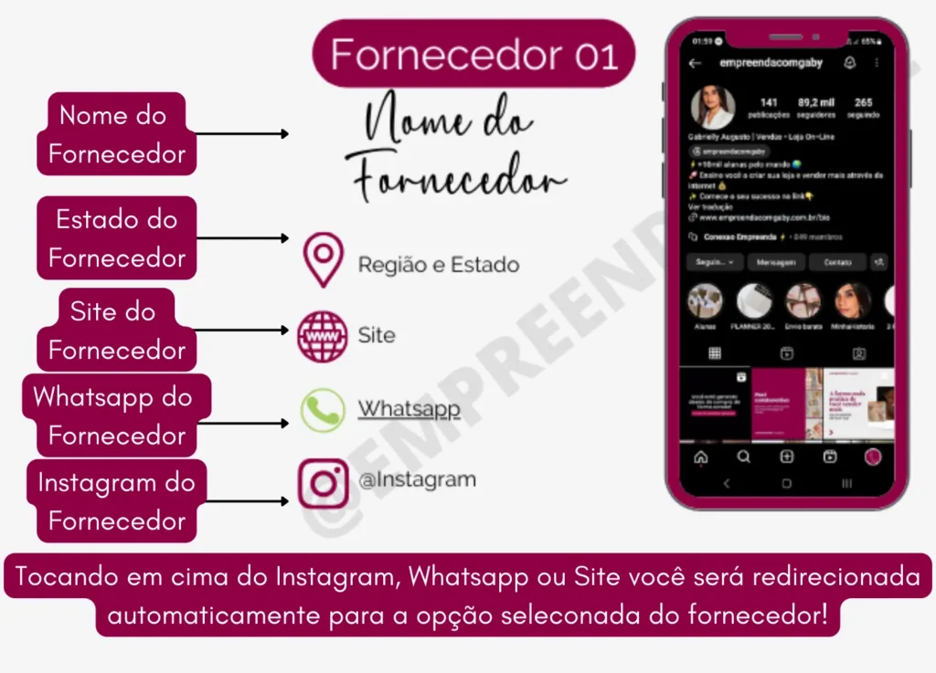 • 03 Super prático: inclui nome, região, site, Instagram e WhatsApp de cada fornecedor.